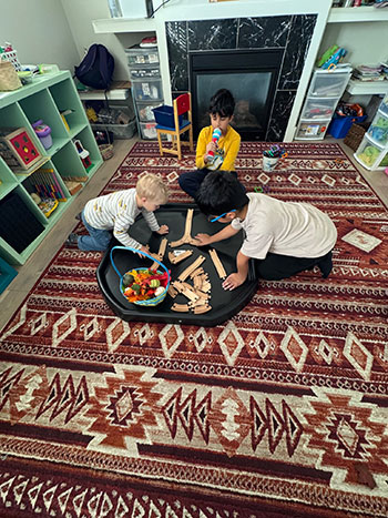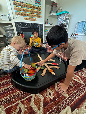 My little friends worked hard as a team and they made a beautiful autumn tree. I gathered all the supplies required to make this beautiful masterpiece. I took a big sized tuff tray and put the wooden tracks in there. Then, I added a basket full of fall-themed loose parts to the tuff tray. I invited Avery, Aviraj and Arnav to make an autumn tree using the train tracks and fall-themed loose parts. They used wooden train tracks to create the structure of a tree. They formed the trunk and branches. Then, they used loose parts like colorful leaves, small pumpkins, wood cookies, pinecones and acorns to decorate the “tree” and made it look like a masterpiece. It’s a great way to combine construction, creativity, and seasonal.